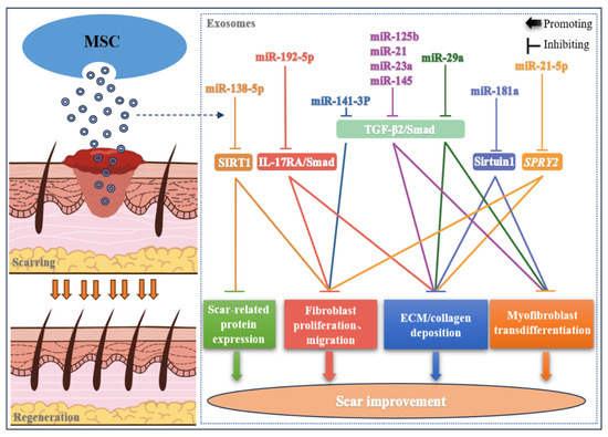 Wound healing is a complex process that involves the proper coordination of a range of regulatory factors to allow the repair of damaged tissue and the restoration of normal skin function. In the process of wound healing, the imbalance of any factor at any stage can lead to the formation of skin scars. Scars are areas of fibrous tissue that replace normal skin after an injury and are a natural consequence of the wound healing process. Hypertrophic scars and keloids are types of skin scars that can be caused by a variety of factors, such as pathological fibrosis, inadequate wound closure, extracellular matrix (ECM) overproduction, chronic inflammation, and excessive collagen deposition [71,72,73]. MSC derivatives such as exosomes have shown similar therapeutic potential to MSC, and their shuttling miRNAs have beneficial paracrine effects on mitigating scar formation by regulating the proliferation, migration, and myofibroblast transdifferentiation of hypertrophic scar fibroblasts, reducing collagen deposition, inhibiting ECM fibrosis, and regulating the expression of scar-related proteins (Figure 2).