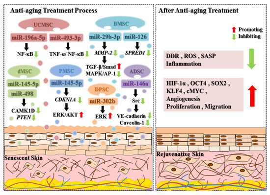 In conclusion, MSC-derived exosomes possess anti-aging effects through their unique miRNAs. They have the potential to reduce senescent cells in tissues by inducing proliferation and reducing SASP in senescent cells. It has been reported that removing senescent cells from tissues leads to a pro-regenerative environment [85]. Therefore, using MSC-derived exosomal miRNAs to remove senescent cells could be a more effective method for promoting skin tissue regeneration or rejuvenation.