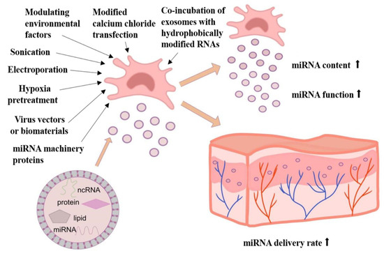 Bioengineering methods to improve exosomal miRNA content and function. A variety of bioengineering approaches can be employed to enhance the content and function of miRNAs secreted by exosomes, such as hypoxic preconditioning of parental cells, modulation of environmental factors, modified calcium chloride transfection methods, electroporation, sonication, co-incubation of exosomes with hydrophobically modified RNAs, and regulation of miRNA machinery proteins. In addition, the use of viruses or biomaterials as vectors can significantly improve the content and function of exosomal miRNAs by increasing their delivery rate.