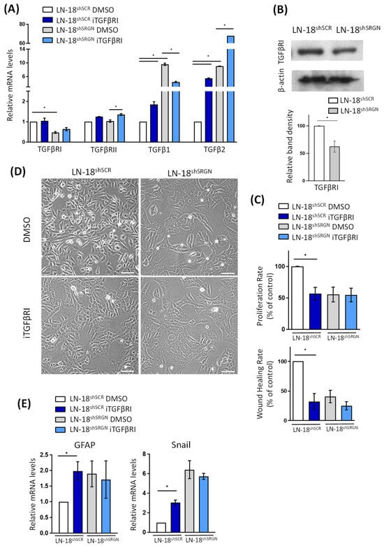 Taking into consideration that TGFβ signaling exerts a potent pro-tumorigenic role in GBM cells controlling their growth, stemness and spread [29,30,31,32,43], we went to investigate the impact of SRGN suppression on the expression of TGFβRI/II and TGFβ1/2. We found that only the mRNA levels of TGFβRI were significantly decreased in LN-18shSRGN compared to LN-18shSCR GBM cells (Figure 2A). Immunoblot analysis confirmed the reduced protein levels of TGFβRI in LN-18shSRGN (Figure 2B). In contrast, the mRNA levels of both TGFβ1 and TGFβ2 were markedly increased in LN-18shSRGN (Figure 2A). The expression of TGFβ1 was upregulated in LN-18shSCR and suppressed in LN-18shSRGN GBM cells after treatment with iTGFβRI (Figure 2A). Elevated TGFβ1 protein levels were detected in the culture media of LN-18shSRGN cells, whereas TGFβ1 secretion was diminished in LN-18shSRGN cells after treatment with iTGFβRI (Figure S1). Interestingly, the expression of TGFβ2 was upregulated in LN-18shSRGN and LN-18shSCR GBM cells after treatment with iTGFβRI (Figure 2A). TGFβ2 secretion in the culture media of LN-18shSRGN and LN-18shSCR GBM cells was not detected in any case (Figure S1). Treatment of LN-18shSCR and LN-18shSRGN cells with iTGFβRI markedly reduced the ability of control LN-18shSCR cells to proliferate and migrate, whereas these properties were not affected in LN-18shSRGN cells, suggesting that a constitutive active TGFβRI signaling occurs only in control LN-18shSCR cells (Figure 2C and Figure S2). The inhibition of TGFβRI in control LN-18shSCR cells induced morphological alterations compatible with astrocytic differentiation (Figure 2D). Control LN-18shSCR cells after treatment with iTGFβRI appeared as clusters forming tight aggregates, losing the typical aggressive phenotype of individual, spindle-shaped LN-18shSCR cells resembling LN-18shSRGN cells that have adopted an astrocytic less-aggressive phenotype [12]. Control LN-18shSCR cells treated with iTGFβRI exhibited elevated expression of specific astrocytoma markers such as GFAP and Snail (Figure 2E). The expression of SRGN seems to be essential for the proper activation of TGFβRI signaling in LN-18 GBM cells to control cell phenotype and functions.
