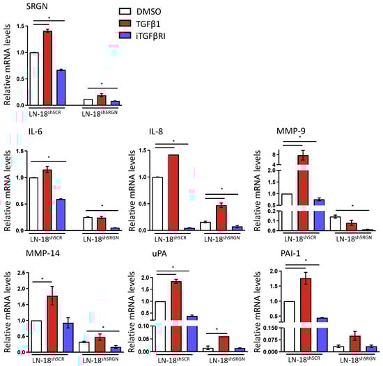 TGFβ signaling affects mainly the inflammatory and proteolytic potential of LN-18shSCR cells. mRNA levels of SRGN, inflammatory and proteolytic molecules in LN-18shSCR and LN-18shSRGN cells after treatment with either TGFβ1 or iTGFβRI. Statistically significant differences are displayed by bars and asterisk * (p < 0.05).