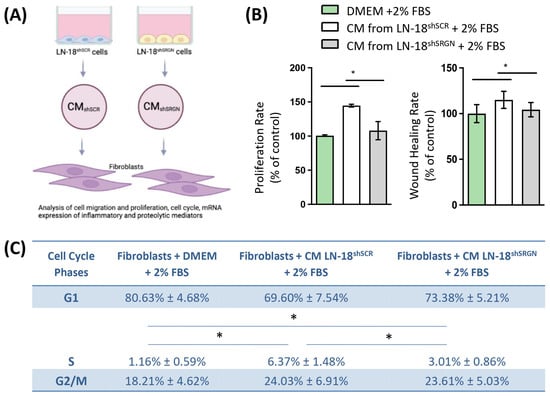 For the investigation of the effect of the CM of LN-18shSCR and LN-18shSRGN cells in fibroblasts, fibroblasts were seeded in 6-well plates and incubated with complete medium for 16 h followed by an incubation period of 4 h with medium supplemented with 2% FBS. Then, fibroblasts were incubated for 48 h with either the CM of LN-18shSCR or LN-18shSRGN cells supplemented with 2% FBS or control medium (DMEM) supplemented with 2% FBS.