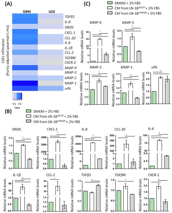 SRGN is important for LN-18 cells to induce inflammatory and proteolytic cascades in fibroblasts, which are linked with their infiltration ability. (A) Significant positive correlation of the expression of SRGN, inflammatory and proteolytic molecules with the infiltration of CAFs in GBM (Timer2, EPIC database). White boxes indicate a non-significant correlation. Value indicates Spearman’s ρ for positive correlation (p < 0.05, ρ > 0) of gene of interest with the infiltration of CAFs in GBM or LGG. (B) mRNA levels of inflammatory mediators and (C) proteolytic enzymes in fibroblasts treated with either culture media (CM) from LN-18shSCR or LN-18shSRGN cells or control media all supplemented with 2% FBS. Statistically significant differences are displayed by bars and asterisk * (p < 0.05).