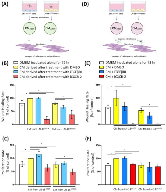 CXCR-2 pathway is critical for the crosstalk of GBM cells and fibroblasts. (A) Schematic illustration of the experimental approach, in which LN-18shSCR and LN-18shSRGN cells were treated with iTGFβRI or iCXCR-2, and their culture media (CM) were collected and tested for their ability to affect functional properties of fibroblasts, such as (B) migration and (C) proliferation. (D) Schematic illustration of the experimental approach, in which CM collected from LN-18shSCR and LN-18shSRGN cells were used to treat fibroblasts in the presence of iTGFβRI or iCXCR-2 to study the effect of respective signaling pathways on functional properties of fibroblasts, such as (E) migration and (F) proliferation. Statistically significant differences are displayed by bars and asterisk * (p < 0.05).