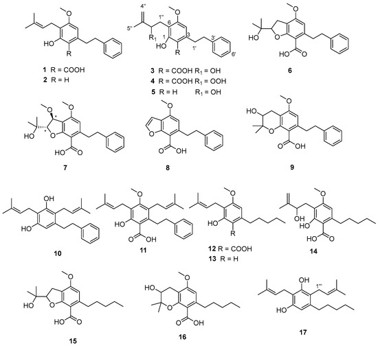 Taking advantage of the information coming from the LC/MS profile, we carried out a first chromatographic purification on silica gel, eluting with a gradient of increasing polarity from n-hexane to MeOH, and obtained 18 fractions. These were extensively purified by HPLC and led to the isolation of 29 pure compounds, whose structures were deduced by application of NMR and HRMS. Comparison of their spectral data with those reported in the literature was instrumental to the identification of the known compounds. The isolated metabolites included 17 amorfrutins, 11 of which belonging to the phenetyl series and were identified as amorfrutin A (1), decarboxyamorfrutin A (2), amorfrutin 3 (3), amorfrutin E (4), amorfrutin F (6), amorfrutin G (7), amorfrutin H (8), amorfrutin I (9), decarboxydemethoxyamorfrutin C (10), amorfrutin C (11), and the new amorfrutin N (5). In addition, six amorfrutins belonging to the pentyl series were obtained and identified as amorfrutin 2 (12), decarboxyamorfrutin 2 (13), amorfrutin J (14), amorfrutin K (15), amorfrutin L (16), and amorfrutin M (17). All the known amorfrutins were identified by comparison of experimental NMR data with those acquired in our previous work [5].