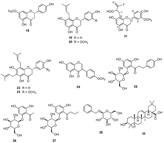 Ten additional polyphenols and the triterpene oleanolic acid (29) [11] were also isolated from extract fractionation. In particular, six flavanone derivatives were obtained and identified as sakuranetin (18) [12], sophoraflavanone B (19) [13], exiguaflavanone K (20) [14], the unprecedented exiguaflavone L (21), lonchocarpol A (22) [15], and shiravanone (23) [16]. In addition, the isoflavonoid biochanin A (24) [17], the chalcone phlorizin (25) [18], the acetophenone myrciaphenone A (26) [19], 6-dihydroxyphenyl-1-butanone-2-β-D-O-glucopyranoside (27) [20], and benzyl-β-D-glucopyranoside (28) [21] were also obtained. The known compounds were identified by comparison of their spectral data with those reported in the literature [12,13,14,15,16,17,18,19,20,21].