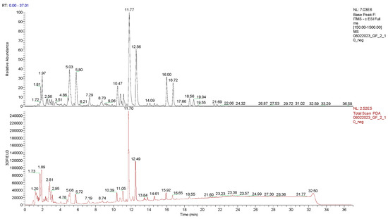 LC-MS base ion peak chromatogram (up) and LC-UV (bottom) chromatogram of the extract obtained from the aerial parts of G. foetida.
