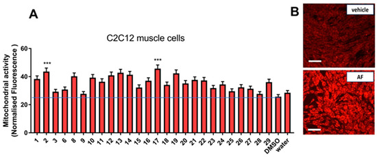 Effect of G. foetida pure metabolites on mitochondrial metabolism in C2C12 cells. (A) Normalized Mito-tracker Red CMX-ROS fluorescence measured upon incubation of C2C12 cells with the indicated G. foetida metabolites (3 μM) for 48 h (values are reported as mean ± SEM and are representative of three independent experiments; *** p < 0.001, all the others p < 0.05); (B) confocal microscopy of C2C12 cells incubated with pooled amorfrutins (Amorfrutin Fraction (AF), 10 mg/L) or with an equivalent amount of vehicle for 48 h and stained with Mito-tracker Red CMX-ROS. Magnification bar = 100 μm. Blue line marks the level of control.