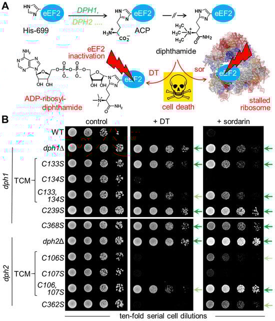 - Ütkür, K.; Mayer, K.; Khan, M.; Manivannan, T.; Schaffrath, R.; Brinkmann, U. DPH1 and DPH2 variants that confer susceptibility to diphthamide deficiency syndrome in human cells and yeast models. Dis. Models Mech. 2023, 16, dmmm050207. [Google Scholar] [CrossRef] [PubMed]