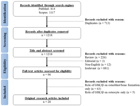 The research questions of current review were: what is the role of GSK3β and its underlying mechanisms in orchestrating osteoclastogenesis and bone resorption? To identify relevant studies, a comprehensive literature search was conducted across in two electronic databases (PubMed and Scopus) in January 2024 using the keyword string: (“glycogen synthase kinase 3” OR GSK3) AND (bone OR osteoporosis OR fracture OR osteoblast OR osteoclast OR osteocyte). All available records from the inception of the databases were gathered. A total of 814 records were retrieved from PubMed database, whereas 1117 records were obtained from the Scopus database. After removing duplicates (n = 713), preliminary screening of the title and abstract were performed to identify and exclude reviews (n = 226), editorials (n = 3), non-English (n = 12), and irrelevant articles (n = 881). Subsequently, full-text articles were screened for eligibility based on the inclusion and exclusion criteria. All original research articles that reported on the phosphorylation status of GSK3β and parameters associated with osteoclastic bone resorption in vivo and in vitro were included. Additionally, studies illustrating the effects of GSK3β inhibitors/knockdown on osteoclastogenesis and bone resorption were included. Studies were excluded if the role of GSK3β on osteogenesis, bone formation, osteoblasts, and osteocytes were reported. A total of 28 articles adhering to the predefined inclusion criteria were incorporated into this review. Although the osteogenic and mechanosensory role of GSK3β in osteoblasts and osteocytes was not discussed in the current review, they are used as keywords for the literature search to avoid overlooking studies with various bone parameters (Figure 1).