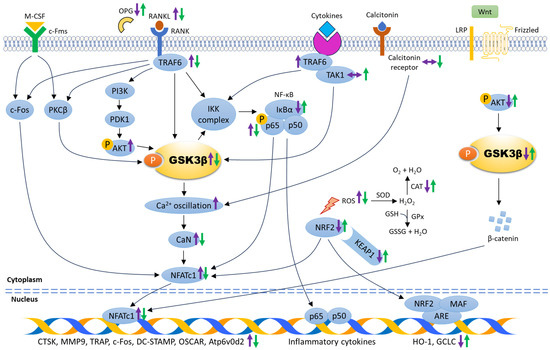 Abbreviations: Atp6v0d2: vacuolar-type proton ATPase subunit d2, BMMs: bone-marrow-derived monocytes or macrophages, Ca2+: calcium, CaN: calcineurin, CAT: catalase, c-Fos: Fos proto-oncogene, CTSK: cathepsin K, DC-STAMP: dendritic cell–specific transmembrane protein, Gα13: guanine nucleotide-binding protein subunit α13, GCLC: glutamate-cysteine ligase, GSK3β: glycogen synthase kinase-3 beta, HO-1: heme-oxygenase 1, IκBα: inhibitor of nuclear factor-kappa B, KEAP1: Kelch-like ECH-associated protein 1, MACF1: microtubule actin crosslinking factor 1, M-CSF: macrophage colony-stimulating factor, MMP9: matrix metalloproteinase-9, NFATc1: nuclear factor of activated T-cells cytoplasmic 1, NRF2: nuclear factor-erythroid 2-related factor 2, OSCAR: osteoclast-associated receptor, p-AKT: phosphorylated protein kinase B, p-GSK3β: phosphorylated glycogen synthase kinase-3 beta, PKC: protein kinase C, PKCβ: protein kinase C beta, p-p65: phosphorylated nuclear factor-kappa B p65, RANKL: receptor activator of nuclear factor-kappa B ligand, ROS: reactive oxygen species, TAK1: transforming growth factor beta-activated kinase 1, TRAF6: tumour necrosis factor receptor-associated factor 6, TRAP: tartrate-resistant acid phosphatase, ↑: increase/upregulate, ↓: decrease/downregulate, ↔: no change.