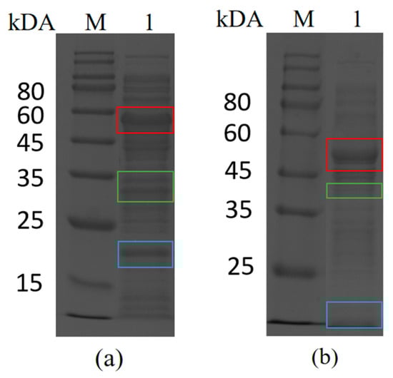 SDS-PAGE analysis of Catcher and Tag self-assembly in vitro. (a) M: Protein Marker; lane 1: mixture after ligation reaction of purified SpyCatcher with BsCR-SpyTag crude enzyme solution. The bands corresponding to SpyCatcher, BsCR-SpyTag, and linker proteins are marked with colored boxes (SpyCatcher: blue box; BsCR-SpyTag: green box; Linker protein: red box). (b) M: Protein Marker; lane 1: mixture after ligation reaction of purified SnoopCatcher with BsGDH-SnoopTag crude enzyme solution. The bands corresponding to SnoopCatcher, BsGDH-SnoopTag, and linker proteins are marked with colored boxes (SnoopCatcher: blue box; BsGDH-SnoopTag: green box; Linker protein: red box).