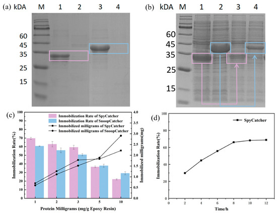 Optimization of immobilization conditions. (a) SDS-PAGE results of immobilization of purified SpyTag and SnoopTag fusion proteins; M: Protein Marker; lane 1: Purified BsCR-SpyTag; lane 2: Protein supernatant after targeted immobilization of purified BsCR-SpyTag with LXTE@SpyCatcher; lane 3: Purified BsGDH-SnoopTag; lane 4: Protein supernatant after targeted immobilization of purified BsGDH-SnoopTag with LXTE@SnoopCatcher. The bands corresponding to BsCR-SpyTag and BsGDH-SnoopTag are marked with colored boxes (BsCR-SpyTag: pink box; BsGDH-SnoopTag: blue box). (b) SDS-PAGE results of SpyTag and SnoopTag fusion proteins before and after immobilization; M: Protein Marker; lane 1: BsCR-SpyTag crude enzyme solution; lane 2: BsGDH-SnoopTag crude enzyme solution; lane 3: Protein supernatant after targeted fixation of BsCR-SpyTag crude enzyme solution with LXTE@SpyCatcher; lane 4: Protein supernatant after targeted fixation of BsGDH-SnoopTag crude enzyme solution with LXTE@SnoopCatcher protein supernatants after fixation. The bands corresponding to BsCR-SpyTag and BsGDH-SnoopTag are marked with colored boxes (BsCR-SpyTag: pink box; BsGDH-SnoopTag: blue box). (c) Relationship between different inputs of SpyCatcher and SnoopCatcher and immobilization efficiency and immobilization amount; (d) Relationship between SpyCatcher immobilization time and immobilization efficiency.