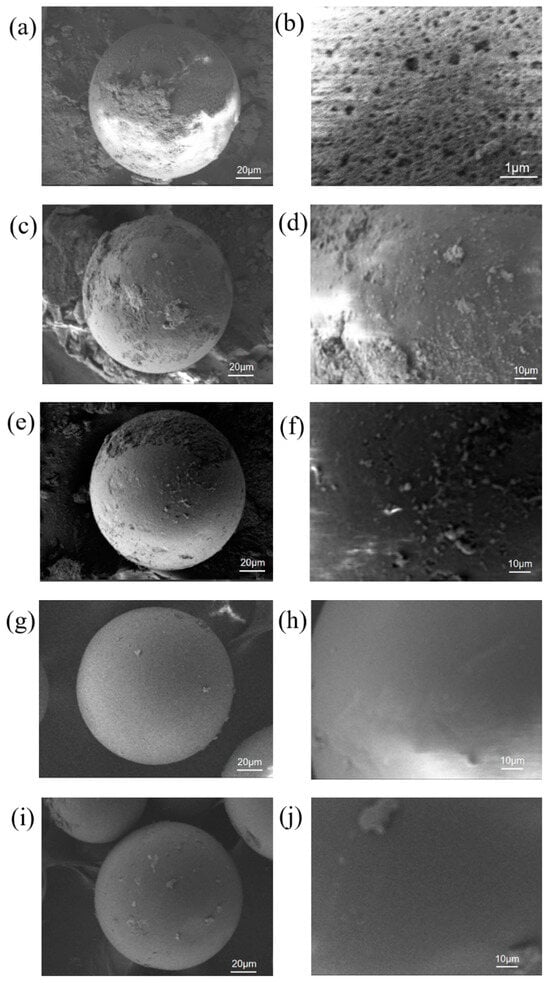 SEM images of the epoxy resin and the immobilized resin. (a,b) LXTE-600; (c,d) LXTE@SpyCatcher; (e,f) LXTE@SnoopCatcher; (g,h) LXTE@BsCR-SpyTag; (i,j) LXTE@BsGDH-SnoopTag. (b,d,f,h,j) were magnified views of the carrier surface.