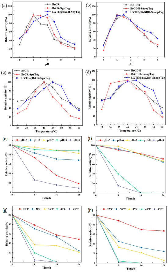 Effect of pH and temperature on catalytic performance of free and immobilized enzymes. (a) Effect of pH on the activity of BsCR, BsCR-SpyTag and LXTE@BsCR-SpyTag: pH 5.0–9.0; (b) Effect of pH on the activity of BsGDH, BsGDH-SnoopTag and LXTE@BsGDH-SnoopTag: pH 5.0–9.0; (c) Effect of temperature on the activity of BsCR, BsCR-SpyTag and LXTE@BsCR-SpyTag: 25–60 °C; (d) Effect of temperature on the activity of BsGDH, BsGDH-SnoopTag and LXTE@BsGDH-SnoopTag: 25–60 °C. (e) pH stability of LXTE@BsCR-SpyTag: various buffers of pH 5.0–9.0 for 24 h at 4 °C. (f) The pH stability of LXTE@BsGDH-SnoopTag: various buffers of pH 5.0–9.0 for 24 h at 4 °C. (g) Temperature stability of LXTE@BsCR-SpyTag: 25 °C, 30 °C, 35 °C, 40 °C and 45 °C, pH 7.0, 24 h. (h) Temperature stability of LXTE@BsGDH-SnoopTag: 25 °C, 30 °C, 35 °C, 40 °C and 45 °C, pH 7.0, 24 h.