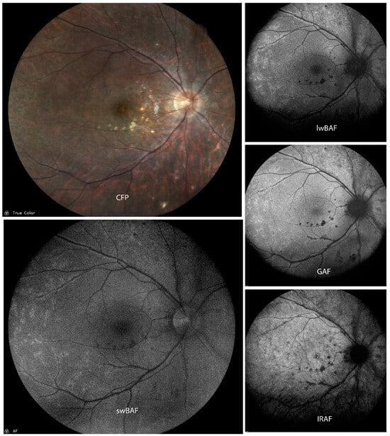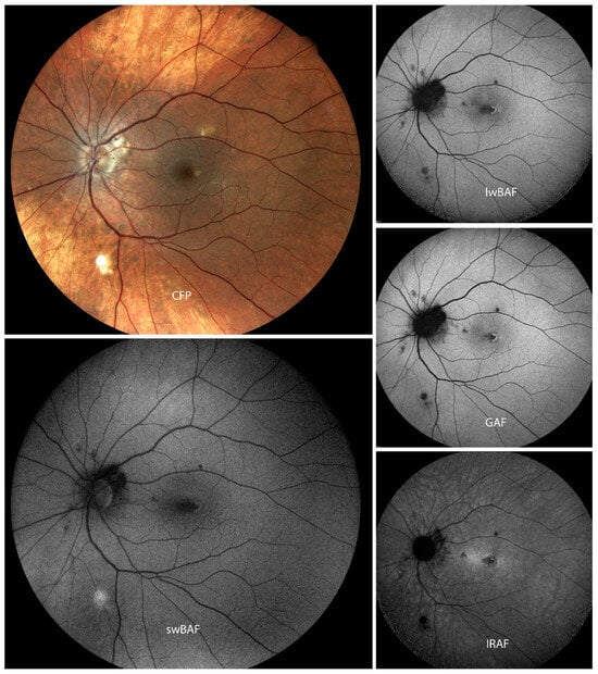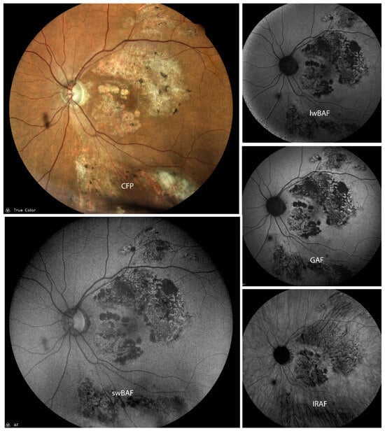 A case of inactive presumed multifocal choroiditis and panuveitis (MCP) on color fundus photography (CFP), short-wavelength blue-light autofluorescence (swBAF, 450 nm), long-wavelength blue-light autofluorescence (lwBAF, 488 nm), green-light autofluorescence (GAF, 518 nm), and infrared-light autofluorescence (IRAF, 787 nm). Bright atrophic MCP lesions are mainly hypoautofluorescent on different FAF modalities. Source: [13].