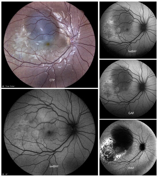A case of inactive cytomegalovirus (CMV) retinitis on color fundus photography (CFP), short-wavelength blue-light autofluorescence (swBAF, 450 nm), long-wavelength blue-light autofluorescence (lwBAF, 488 nm), green-light autofluorescence (GAF, 518 nm), and infrared-light autofluorescence (IRAF, 787 nm). A mixed pattern of hypo- and hyperautofluorescence is evident on the different FAF modalities. Source: [13].
