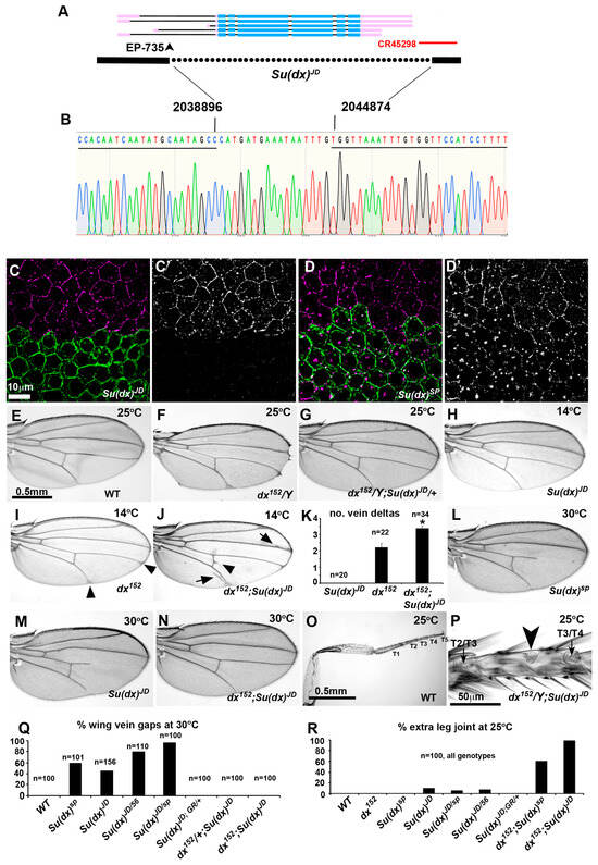 We compared the phenotypes of Su(dx)JD with those previously described for existing Su(dx) alleles. As with other alleles, Su(dx)JD acted as a dominant suppressor of the dx mutant phenotype (Figure 1E–G), suppressing the wing margin and vein thickening phenotypes, and also dominantly suppressing the wing margin phenotype of notchoid1 (nd1), a hypomorphic allele of Notch. This combination also produced a wing vein gap phenotype that has previously been observed in the interaction between Su(dx)sp and nd1, although this was less extensive and at a lower penetrance with the JD allele (Supplementary Figure S2). At 14 °C, the Su(dx)JD allele displayed a similar genetic interaction with the dx152 null allele to that previously described for the Su(dx)sp allele. At this low temperature, Su(dx)JD wings appear to be wild-type, while dx152 wings have small deltas where the longitudinal veins meet the wing margin (Figure 2H,I). The double homozygous combination of dx152 with Su(dx)JD results in increased numbers of vein deltas per wing, which are also increased in severity, together with additional vein thickening and cross vein spurs, hence Su(dx)JD acts as an enhancer of dx at this low temperature (Figure 2J,K). At 30 °C, Su(dx)JD had a similar, recessive, temperature-dependent wing vein loss phenotype to other Su(dx) alleles (Figure 1L,M,Q), a phenotype indicative of a Notch gain of function, although the null allele had a lower penetrance for this phenotype than the sp allele. Su(dx)JD failed to complement Su(dx)sp and Su(dx)56 for this phenotype (Figure 1Q) and, furthermore, the wing phenotypes of Su(dx)JD were rescued by a single copy of a genomic rescue construct carrying the WT Su(dx) gene (Figure 1Q). The dx mutation also rescued the Su(dx)JD wing phenotypes (Figure 1N,Q), as it does with the other alleles [12]. The latter combination, at 25 °C, also resulted in extra leg joints, indicative of increased Notch activity (Figure 1O,P,R), an interaction previously observed with the Su(dx)sp allele [14]. Unlike with Su(dx)sp, the null allele also showed a small percentage of legs with extra joints in a WT context, a phenotype which was rescued by the genomic Su(dx) rescue construct (Figure 1R). We conclude, therefore, that Su(dx)JD is a defined null of the Su(dx) gene with adult wing and leg phenotypes that are qualitatively similar to those of previously described Su(dx) alleles.