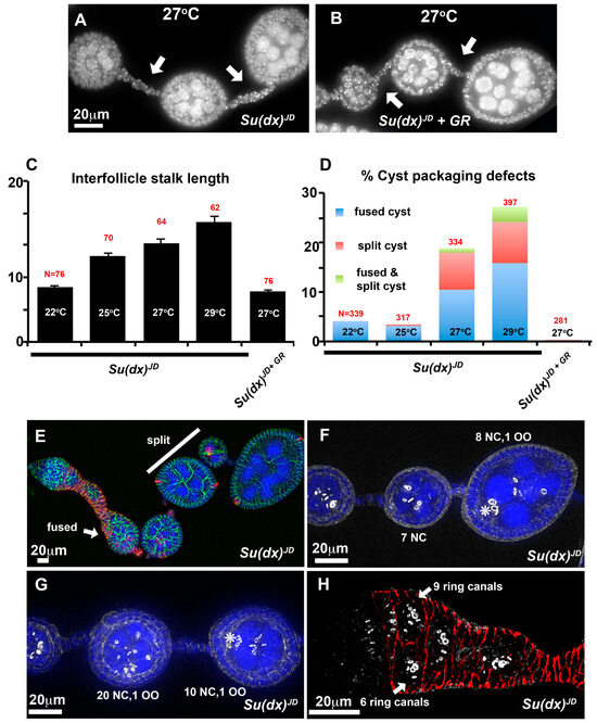 Unlike in the wing and leg, the ovary phenotypes of the Su(dx)JD allele markedly differed from the Su(dx)sp allele, as the null allele flies displayed significantly longer stalks than the wild type, and this phenotype was also rescued by the Su(dx) wild-type genomic rescue construct (Figure 3A–C). The long stalk phenotype was temperature-dependent and increased in length at higher temperatures (Figure 3C). The egg chamber phenotypes also differed from those of Su(dx)sp. Instead of compound and unseparated egg chambers, we observed split cysts in which the normal complement of 16 germline cells were split across two adjacent incomplete follicles or split/fused egg chambers in which some of the germline cells of one egg chamber were split off from one cyst and incorporated into an adjacent chamber (Figure 3D–G). Complete egg chamber fusions that combined two complete cysts into a single egg chamber were also observed (Figure 3E). The splitting of cysts could already be observed within the germarium (Figure 3H). Cyst packaging phenotypes were also rescued by the Su(dx) WT genomic rescue construct.