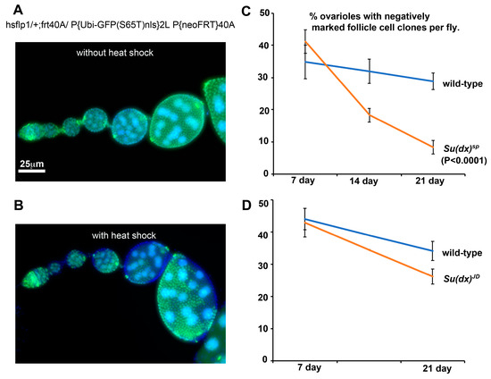 To enable mitotic clone generation, Su(dx)sp and Su(dx)JD alleles were recombined with frt40A (Bloomington, IN, USA). For positive marked clones, frt40, Su(dx) lines were crossed to hsflp1, uas cd8gfp:tubgal80, frt40A; actgal4 (Bloomington). For the follicle stem cell turnover assay, using negatively marked Su(dx)sp, Su(dx)JD and WT control clones, the following stocks were generated: hsflp1/+;Su(dx)frt40A/P{Ubi-GFP(S65T)nls}2L P{neoFRT}40A and hsflp1/+;frt40A/P{Ubi-GFP(S65T)nls}2L P{neoFRT}40A, using component stocks obtained from Bloomington. One-day-old adult flies were heat-shocked for 60 min at 40 °C and then reared for minimum of 1 week at 25 °C to ensure that any clones generated in the dividing follicle cells were cleared from the germarium and egg chambers and that the clones scored, up to stage 5 egg chambers inclusive, originated in the stem cells.