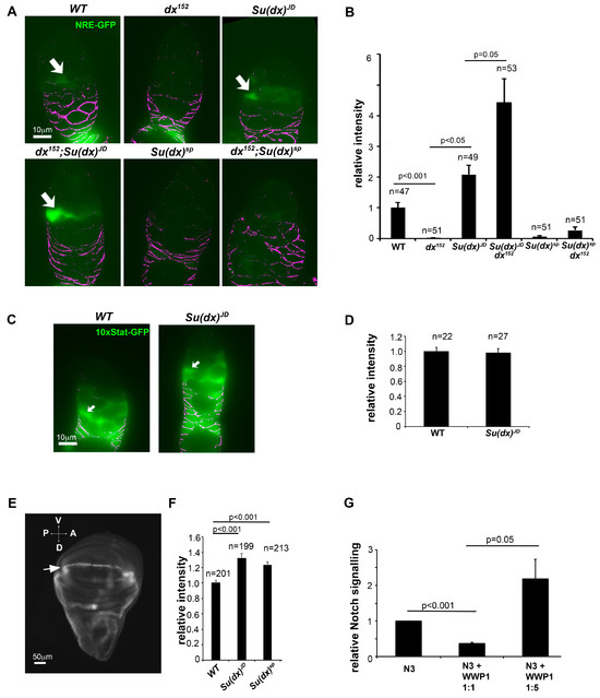 The phenotypic characterisation of Su(dx) alleles demonstrated that the null allele phenotypes in the wing and leg were consistent with those previously published and indicative of increased Notch activity. A gain of Notch function phenotype was also observed for the null phenotype in the ovary. However, the Su(dx)sp allele showed ovary phenotypes indicative of a loss of Notch signalling, despite the same allele resulting in a Notch gain of function during wing and leg development. Phenotypic outcomes can be difficult to interpret when multiple processes are affected. Therefore, to observe how different Su(dx) mutant alleles affect Notch signalling directly, we investigated the Notch activity marked by fluorescent Notch signal reporters driven by the Notch response element NRE (Figure 6). In the germarium, Notch signalling was detected in cells just anterior to the FasIII-positive cells, in the location of the somatic stem cells, as observed previously [28]. Su(dx)sp significantly reduced the Notch activity marked by the NRE reporter. In contrast, Su(dx)JD significantly increased Notch activity (Figure 6A,B). This effect was specific to Notch activity, as Su(dx)JD did not affect JAK-STAT signalling levels (Figure 6C,D). The latter is a pathway also involved in cyst packaging and egg chamber separation by follicle cells [30]. We tested how the different alleles interacted with a null mutant of dx [21]. The dx152 allele alone had reduced Notch activity when measured by this reporter, and there was not any significant rescue of Notch signalling levels when in combination with Su(dx)sp (Figure 6A,B). However, Su(dx)JD rescued the Notch signalling loss in a dx mutant and this combination had a higher Notch activity than Su(dx)JD alone (Figure 6A,B). In the wing imaginal discs, both the Su(dx)sp and Su(dx)JD alleles increased Notch activation in the dorsal/ventral boundary compared to WT, in agreement with the adult phenotype data that indicated a gain of Notch function in the wings of both mutants (Figure 6E,F). The results further illustrate the complexity of the phenotypic outcomes of the Notch ubiquitin ligase regulators that tune Notch signalling levels up or down in different developmental contexts. We investigated how a human homologue of Su(dx), WWP1, affected human NOTCH3 signalling. Like Drosophila Notch, NOTCH3 has a PPXY motif in its intracellular domain which is a recognition motif for the WW domains found in Su(dx)-related proteins [31]. We found that WWP1 showed a dosage-dependent regulation of NOTCH3 signalling, decreasing NOTCH3 activity when cotransfected at low ratios but increasing NOTCH3 activity at higher doses of WWP1 transfection (Figure 6G). Thus, both human and Drosophila Su(dx) proteins share the potential to act on Notch signalling in either a positive or negative manner.