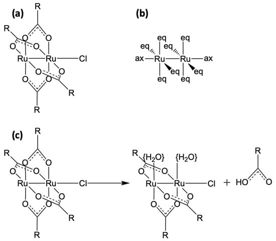 - Aquino, M.A. Recent developments in the synthesis and properties of diruthenium tetracarboxylates. Coord. Chem. Rev. 2004, 248, 1025–1045. [Google Scholar] [CrossRef]