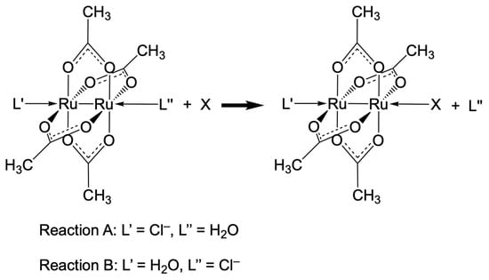 - Santos, R.L.S.R.; van Eldik, R.; Silva, D.d.O. Thermodynamics of Axial Substitution and Kinetics of Reactions with Amino Acids for the Paddlewheel Complex Tetrakis(acetato)chloridodiruthenium(II,III). Inorg. Chem. 2012, 51, 6615–6625. [Google Scholar] [CrossRef]