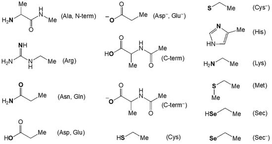 Two protonation states were utilised for aspartic acid, the C-terminal carboxylate, cysteine, and selenocysteine: a neutral one and an anionic one. For arginine, histidine, lysine, and the N-terminal, only the neutral state was employed because of their inability to coordinate in their protonated states (Figure 4).