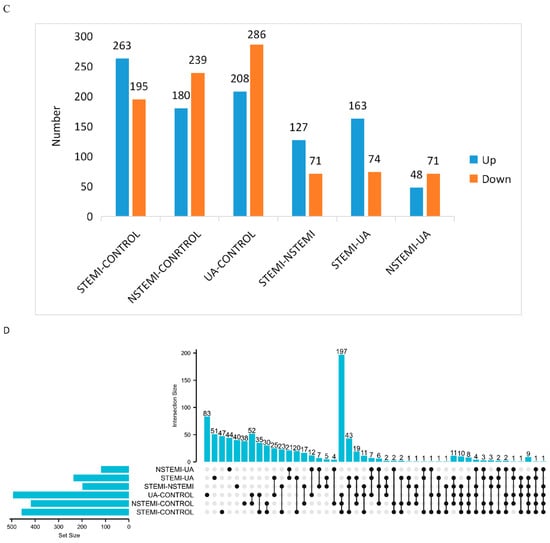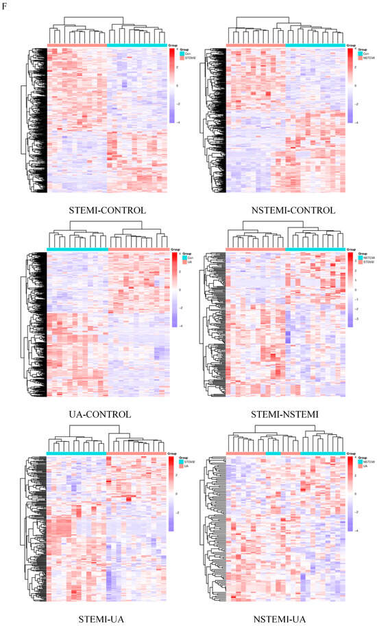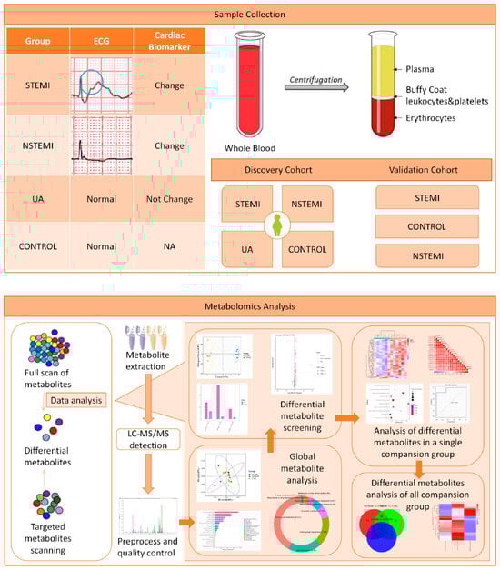 The plasma samples were analyzed by metabolomics. The details of the methods were described in the previous studies [16,17,18,19]. Metabolites were extracted, detected by LC-MS/MS, and then analyzed. The DMs between the two biological groups were screened by variable important in projection (VIP), fold change (FC), and p value. In this study, VIP ≥ 1, FC ≥ 1.2 or ≤0.83, and p < 0.05 were simultaneously satisfied. Cluster analysis, correlation analysis, enrichment analysis, and ROC analysis, etc., were carried out on the DMs in each comparison. The non-targeted OMICs study had four groups including the STEMI, NSTEMI, UA, and CONTROL (CTRL) groups (n = 12 in each group).