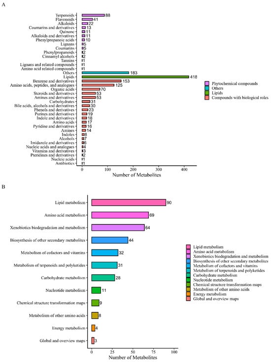 The identified metabolites were annotated by classification and function to understand the classification and functional characteristics of DMs using the KEGG and HMDB databases. The functional annotation of pathways was made through the KEGG PATHWAY database to determine the main biochemical metabolic pathways and signal transduction pathways that the DMs were involved in.