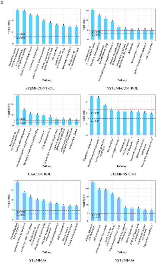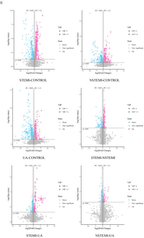 In the discovery phase (STEMI, NSTEMI, UA, CTRL), a total of 2531 metabolites including 1925 DMs were identified, according to FC, p value, and VIP. These metabolites can be roughly divided into the following four categories: compounds with biological roles, lipids, phytochemical compounds, and others (Figure 2A), and were enriched in the 12 pathways of KEGG (Figure 2B). Figure 2C,D show the specific results. Figure 2E is a volcano map based on the DMs between each of the paired groups.