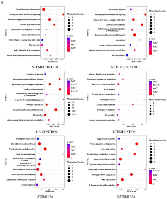Cluster and enrichment analysis of differential metabolites verified by targeted metabolomics. (A) Metabolite classification bar chart. (B) Metabolic pathway classification bar chart. (C) Column chart of metabolic pathway enrichment analysis of “STEMI–CTRL”. (D) Bubble diagram of metabolic pathway enrichment analysis of “STEMI–CTRL”. (E) Column chart of metabolic pathway enrichment analysis of “NSTEMI–CTRL”. (F) Bubble diagram of metabolic pathway enrichment analysis of “NSTEMI–CTRL”. (G) Column chart of metabolic pathway enrichment analysis of “STEMI–NSTEMI”. (H) Bubble diagram of metabolic pathway enrichment analysis of “STEMI–NSTEMI”.