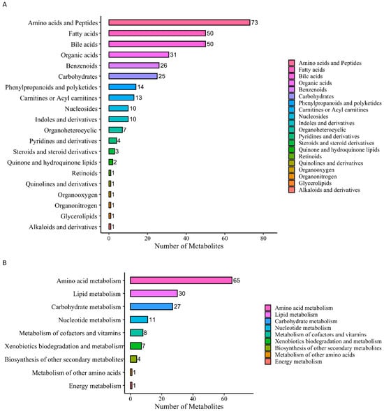 There were 27 DMs selected from the discovery phase for further validation using a HM Meta 700 panel (BGI, Shenzhen, China) that including 700 metabolites. In this validation phase, 324 metabolites were identified. These metabolites were divided into 20 categories (Figure 3A), among which amino acids and peptides, fatty acids, bile acids, organic acids, benzenoids, and carbohydrates were the main categories and included 255 metabolites, accounting for 78.7% of the total metabolites. In the KEGG analysis, a total of 154 metabolites were enriched in nine metabolic pathways (Figure 3B).