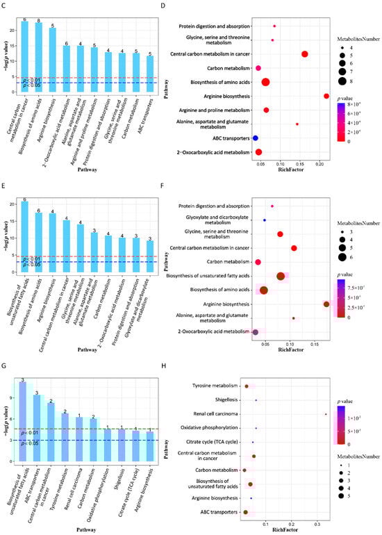 Figure 3C–H analyze metabolic pathways of DMs based on the KEGG database. Figure 3C,E,G show the top ten metabolic pathways with the smallest p value in each control group, and the number of the same DMs concentrated in each pathway. Figure 3D,F,H show the proportions, quantities, and p value of metabolites annotated to different pathways. Supplementary Table S3 summarizes the top three metabolic pathways and the largest proportion and number of enriched DM pathways in each comparison.
