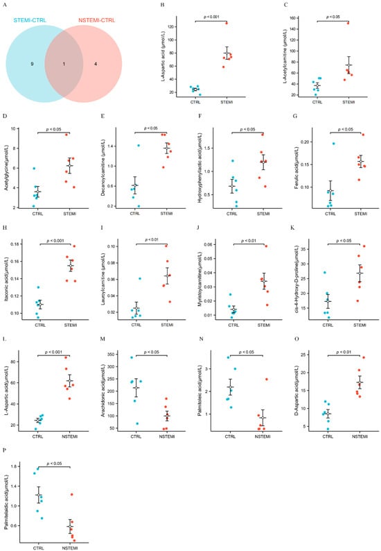 Figure 4B–K are grouping comparison diagrams of 10 DMs in the “STEMI–CTRL” comparison, showing that the expression level in the STEMI group is significantly higher than in the CTRL group. Similarly, Figure 4L–P compare five DMs in the “NSTEMI–CTRL” comparison, showing that the expression levels of L-aspartic acid and D-aspartic acid in the NSTEMI group are significantly higher than in the CTRL group. Further, the expression levels of arachidonic acid, palmitoleic acid, and palmitelaidic acid in the NSTEMI group are significantly lower than those in the CTRL group.