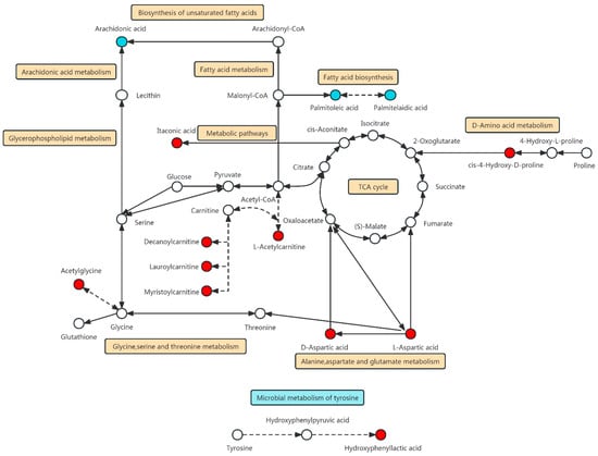 Diagram of the integrated metabolic pathways of the 14 differential metabolites in myocardial infarction discovered from this study. The metabolic pathway integration map contains 11 metabolic pathways of 13 differential metabolites (metabolic pathway of ferulic acid related biological system was not found in the database), including the following 10 modified KEGG maps: “hsa00470 D-Amino acid metabolism”, “hsa00020 Citrate cycle (TCA cycle)”, “hsa00061 Fatty acid biosynthesis”, “hsa00250 Alanine, aspartate, and glutamate metabolism”, “hsa00260 Glycine, serine, and threonine metabolism”, “hsa01100 Metabolic pathways”, “hsa01040 Biosynthesis of unsaturated fatty acids”, “hsa01212 Fatty acid metabolism”, “hsa00564 Glycerophospholipid metabolism”, “hsa00590 Arachidonic acid metabolism” and 1 pathway obtained from the literature review, “Microbial metabolism of tyrosine. (Dots represent metabolites, red is upregulated and blue is downregulated. The line represents the metabolic pathway, the straight line is quoted by KEGG, and the dotted line is quoted by literature review).