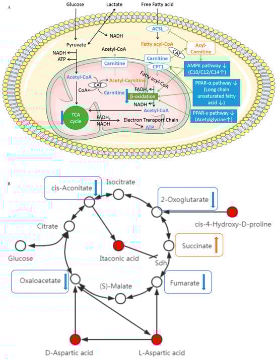 Figure 6B shows the metabolic relationship between L-aspartic acid, D-aspartate, cis-4-hydroxy-D-proline, itaconic acid, and the TCA cycle. The increase in these four DMs directly leads to the decrease in related substances in the TCA cycle. Moreover, the accumulation of itaconic acid inhibits the activity of succinate dehydrogenase (Sdh) [26]. The above results affect or even interrupt the TCA cycle and ultimately affect the energy metabolism of the heart.