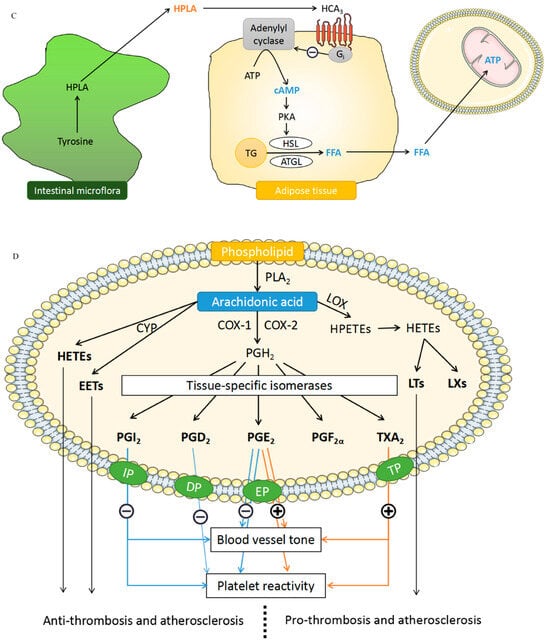 HPLA is produced by the human intestinal flora through tyrosine metabolism [33]. HCA3 is a Gi protein-coupled receptor that plays an important role in maintaining energy homeostasis [34]. As shown in Figure 6C, HPLA activates the HCA3 receptor, inhibits adenylate cyclase, and reduces cAMP level [35]. The decrease in cAMP leads to low free fatty acids (FFA) and thus reduces the production of ATP. In addition, HCA3 also leads to the negative feedback mechanism of β-oxidation of FFA [34].