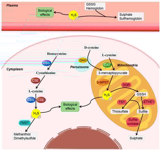 H2S is a small-molecule gasotransmitter that is highly lipophilic and can, therefore, penetrate cell membranes without the aid of specific transporter proteins or receptors. In the human body, H2S exists mainly as a hydrosulfide ion (HS-) and, to a lesser extent, as a free gas. Through a sequence of reactions, it is possible for it to undergo oxidation and produce sulfur dioxide, sulfates, and elemental sulfur, as well as various other substances [28,29]. A dynamic equilibrium is maintained between H2S and HS to ensure the stability of H2S in vivo and maintain the normal pH of the internal environment. In mammals, endogenous H2S is produced through desulfurization of cysteine, a process that involves three major tissue-specific enzymes, namely, cystathionine-β-synthase (CBS), cystathionine gamma-lyase (CSE), and 3-mercaptopyruvate sulfurtransferase (3-MPST) [30,31]. Both CBS and CSE are localized in the cytoplasm, whereas 3-MPST is mainly localized in mitochondria [32,33]. Endogenous H2S is generated from L-cysteine (L-Cys) and homocysteine by CBS and CSE [34,35]. In addition, it can be generated from 3-mercaptopyruvate by 3-MPST. 3-mercaptopyruvate is produced from either L-Cys (CAT/MPST pathway) by cysteine aminotransferase (CAT) or D-cysteine (DAO/MPST pathway) by amino acid oxidase (DAO) [36,37]. H2S is metabolized through the following three mechanisms in vivo: (1) Mitochondrial oxidation: H2S is first catalyzed by sulfide quinone oxidoreductase (SQR) at the inner mitochondrial membrane to form glutathione persulfide (GSSH), which is then oxidized to sulfite by persulfide dioxygenase (ETHE1) in the mitochondrial matrix. Sulfite can be further oxidized to sulfate by sulfite oxidase or reacted with GSSH to form thiosulfate under the transsulfuration of thiosulfate:cyanide sulfurtransferase (TST, rhodanese) [38,39]; (2) Cytoplasmic methylation: H2S is metabolized in the cytoplasm by thiol-S-methyltransferase (TMST) to methyl mercaptan, which is subsequently converted to dimethyl sulfide [40,41]; (3) Plasma molecule binding: Free H2S in plasma can bind to glutathione disulfide (GSSG) or other metal- or disulfide-containing molecules, such as hemoglobin, to form sulfate or H2S conjugates such as sulfhemoglobin (see Figure 1) [42,43]. The metabolite excretion occurs primarily via the kidney, spleen, and lungs. In the body, H2S levels remain controversial. The estimated physiological levels of circulating H2S range from 10 to 100 μM [44], whereas the concentration of peripheral H2S is estimated to be 30–100 μM [45], which may be lower in the reproductive system, with only nanomolar levels in the corpus cavernosum [46].