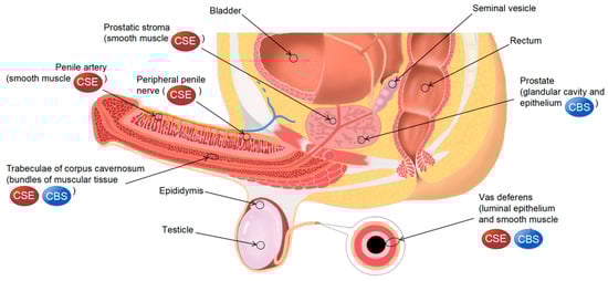 H2S generated within the male reproductive system was first identified in rabbit cavernous smooth muscle [47]. Shortly thereafter, d’Emmanuele et al. [17] demonstrated that CBS and CSE were found to produce endogenous H2S in the human corpus cavernosum (HCC) and identified the location of the two enzymes via immunohistochemical analysis of tissues. CSE was found in peripheral nerves and vascular smooth muscle cells (SMCs) of the penile and trabecular muscular tissue of HCC, while CBS was primarily found in trabecular muscular tissue. Both CBS and CSE were determined in the human prostate, with CBS substantially localized in the lumen and epithelial cells and CSE in the periacinar stroma [48,49]. The species and tissue distribution of H2S synthases expressed in other mammals, such as rats and mice, differ slightly from those in humans (Figure 2). In rat penile tissue, cavernous smooth muscle cells (CCSMCs) express CSE, CBS, CAT, DAO, and 3-MPST but lack the expression of CBS [50,51]. CBS, CSE, and 3-MPST are predominantly expressed in the mouse corpus cavernosum, especially in luminal endothelial cells and vascular endothelial cells. However, immunohistochemical findings have shown that the expression of CSE is higher than that of CBS and 3-MPST [52]. In addition, only CBS is expressed in the luminal subcutaneous smooth muscle, vascular smooth muscle, and peripheral nerves of the corpus cavernosum [53]. In a study, five enzymes that produce H2S were found in the prostates of rats. CBS, MPST, and CAT were mainly localized in glandular epithelial cells. In contrast to MPST expression, CBS expression was significantly higher in PR-V than in PR-D, whereas CAT expression was not significantly different between the two sites [36]. CSE is essential for H2S synthesis in the mouse prostate, with its expression decreasing with age [54].