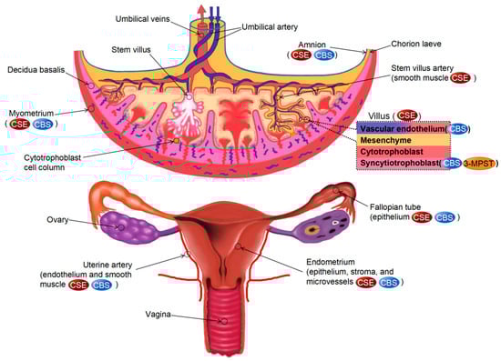 Patel et al. [57] were the first to examine the production of endogenous H2S and the distribution of CBS and CSE in human and rat uterine tissues. They qualitatively detected the expression of CBS and CES in the non-pregnant uterus, pregnant uterus, placenta, and fetal membranes of rats and the chorionic villi, amnion, and myometrium of the human placenta using protein blotting. Subsequent studies have indicated that 3-MPST is present in the human placenta, with CBS and CSE predominantly found in syncytiotrophoblasts and vascular endothelial cells in the chorionic villi. Meanwhile, 3-MPST was observed in syncytiotrophoblasts [58,59]. In addition, CSE is expressed in trophoblasts and mesenchymal cells within the chorionic core of human placental villi and in the SMCs of chorionic trunk arteries [60,61]. Unlike the expression of CBS and CSE, the expression of 3-MPST in placental tissues does not show a significant difference between a healthy female and a female with pre-eclampsia [59]. A similar expression of CBS and CSE is observed in the endothelial cells and SMCs of human uterine arteries [62,63]. In addition, 3-MPST and CAT are expressed in human uterine arteries. The levels of CBS mRNA and protein are increased during gestation and the proliferating stage of the menstrual cycle; however, CSE, 3-MPST, and CAT protein expression do not undergo significant changes during these periods [62]. In human endometrium, the expression of CBS is upregulated during these two periods, whereas that of CSE is not significantly altered. CBS and CSE are primarily found in the epithelium, stroma, and microvessels within the human endometrium. However, CBS is specifically located in stromal cells and blood vessels during pregnancy and the proliferative stage of the menstrual cycle [64]. In mouse ovaries, CBS is expressed in follicular cells at all stages, with its expression being higher in primary and primordial follicles than in secondary and sinus follicles. After follicular development, granulosa cells are divided into cumulus cells and mural granulosa cells, and high levels of CBS are observed in both subpopulations. However, CBS is not found in oocytes [15]. In human fallopian tubes, CBS and CSE are determined in the tubal epithelium [26]. Similarly, both enzymes are expressed in human vaginal tissues. Sun et al. [65] found that CBS and CSE are predominantly discovered in rat vaginal epithelial cells (VK2/E6E7), and CSE was expressed in rat vaginal vessels by immunohistochemical analysis (Figure 3).