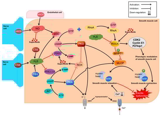 These conflicting results indicate that the mechanism by which the relaxation effects of H2S on CC smooth muscles in vivo may not be dependent on the NO-cGMP pathway. However, endogenous H2S inhibits phosphodiesterase (PDE) to suppress cGMP degradation [113]. Several studies have shown that H2S in the penis regulates cGMP levels by acting on sGC. For example, treatment with L-Cys (1 μM–1 mM) and NaHS (1 μM–1 mM) increases cGMP levels in HCC, whereas administration with ODQ, an inhibitor of sGC, reverses this effect [114]. The decrease in H2S content in CSE-KO mice weakens the redox state of sGC, thereby downregulating cGMP in the penis [83], suggesting that H2S promotes penile erection by upregulating cGMP through other pathways.