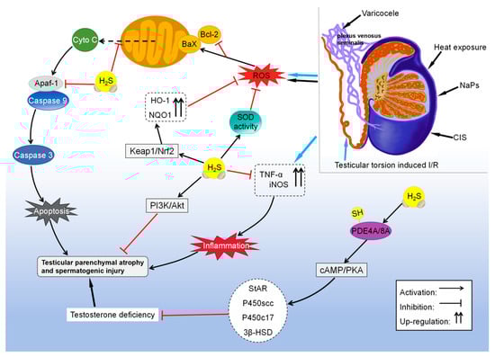 H2S has been shown to alleviate testicular dysfunction and germ cell apoptosis caused by toxic substances. A study found that treatment with the antineoplastic drug cisplatin significantly increased MDA levels and decreased SOD activity in rat testicular tissues. However, administration of NaHS counteracted all biochemical, histological, and morphological changes induced by cisplatin [126]. The researchers found that nanoplastics induced ROS-dependent mitochondrial apoptosis and autophagy in GC-2spd(ts) cells derived from mouse spermatocytes, resulting in reproductive toxicity. H2S alleviated nanoplastic-induced reproductive toxicity by increasing the expression of antioxidant enzymes such as HO-1 and NQO1 through Keap1/Nrf2 signaling [89]. Testosterone deficiency can affect the normal morphological features and motility of sperm and impair male fertility [127]. It was shown that overexpression of CBS restored testosterone levels by promoting the S-sulfhydration of PDE4A and PDE8A and activating the cAMP/PKA pathway in mouse stromal tumor cell (MLTC-1) models of lipopolysaccharide (LPS)- and hydrogen peroxide (H2O2)-induced testosterone synthesis impairment [91].