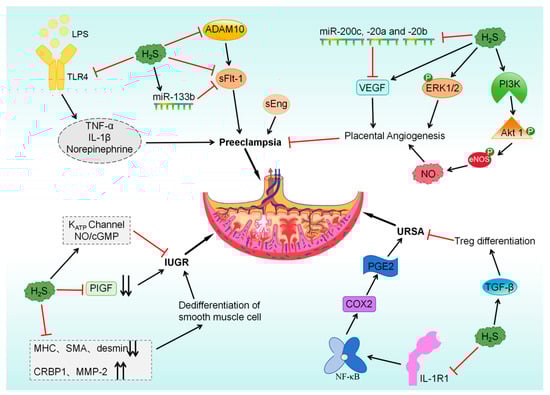 Regulatory mechanism of H2S in pre-eclampsia, URSA, and IUGR. URSA: unexplained recurrent spontaneous abortion; IUGR: intrauterine growth restriction.