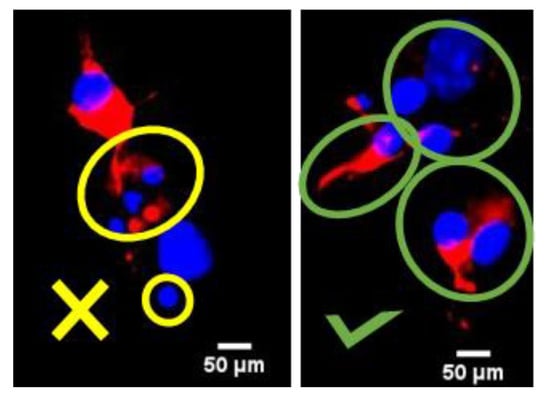 On day 6, the cells in culture were treated with different concentrations of glutamate (0 µM, 50 µM, 150 µM, 300 µM, 1000 µM, and 50,000 µM, Sigma-Aldrich, Darmstadt, Germany). To add the treatment, half of the medium was removed from each well. Double the amount of the desired final concentration of glutamate was added to the medium, then it was mixed and put back again into the wells to prevent the removal of the neuronal growing factors that were already established in the wells. The cells were incubated with the treatment for 24 h at 37 °C, 5% CO2, and 100% humidity. One hundred intact nuclei (Figure 2) of three fields per sample were counted based only on the DAPI signal (specific marker to label nuclei of all cells—glia and neurons). Viable neurons were identified and included only if the cells were positive for MAP2 (specific biomarker for neurons, anti-Alexa594, Proteintech Germany GmbH, Planegg-Martinsried, Germany). The data were normalized to percentage by using the control as 100%. Imaging was performed on a Nikon microscope with a DS-FI3 camera (Nikon, Tokyo, Japan) with a 10× objective magnification. The images were acquired in NIS-Elements software (version 5.21.00, Nikon, Tokyo, Japan). Images were processed in ImageJ (Version 2.14, National Institutes of Health, NIH, Bethesda, MD, USA).