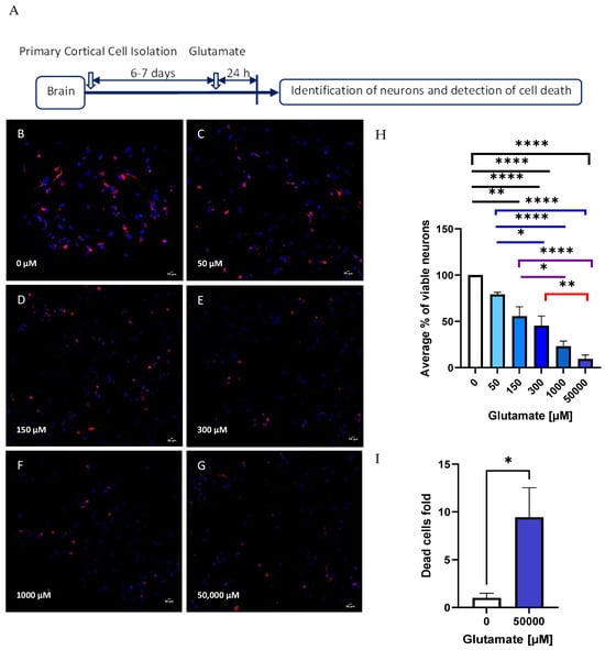 Primary cortical cells isolated from Sprague-Dawley rats. (A) Experimental design of cell isolation and treatment with glutamate. The cells were treated with different concentrations of glutamate: (B) control (no treatment), (C) 50 µM, (D) 150 µM, (E) 300 µM, (F) 1000 µM, and (G) 50,000 µM. (H) Shows the quantification of percentage of viable neurons (detected by immunostaining method) after the treatment. Higher concentrations of glutamate decrease the percentage of viable neurons. (I) The same result was confirmed by an enzymatic method used to detect dead cells (LDH release). Both methods show a reduction in neurons in 10-folds when the primary cortical cells were treated with 50,000 µM in comparison to the control. Treatment with 50,000 µM of glutamate killed 90% of neurons. Data are presented as a mean ± SEM. n = 5–7 independent biological samples with 2–3 technical replicates. Statistical significance was determined using one-way ANOVA and Tukey’s multiple comparison tests. * p < 0.05; ** p < 0.01; **** p < 0.0001. Red: MAP2 marker to detect microtubules in the neurons; blue: DAPI. Scale bar = 50 µm.