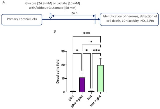 (A) Experimental design of cells cultured with specific media. The cells were isolated and cultured for 6–7 days. On the last day of culture, the medium was exchanged for glucose standard medium [24.9 mM] or glucose-free medium with lactate [10 mM] and glutamate [50 mM]. (B) Dead primary cortical cells, isolated from Sprague-Dawley rats, after adding different treatments: glucose, glucose + glutamate, lactate, lactate + glutamate. Treatment with glutamate resulted in a statistically significant increase in dead cells compared to untreated cells. Data are presented as a mean ± SEM; n = 7; independent biological samples with 3 technical replicates. Statistical significance was determined using one-way ANOVA with Holm–Sidak test. * p < 0.05; *** p < 0.001. gluc: glucose; glut: glutamate; lact: lactate.