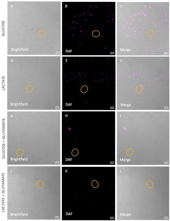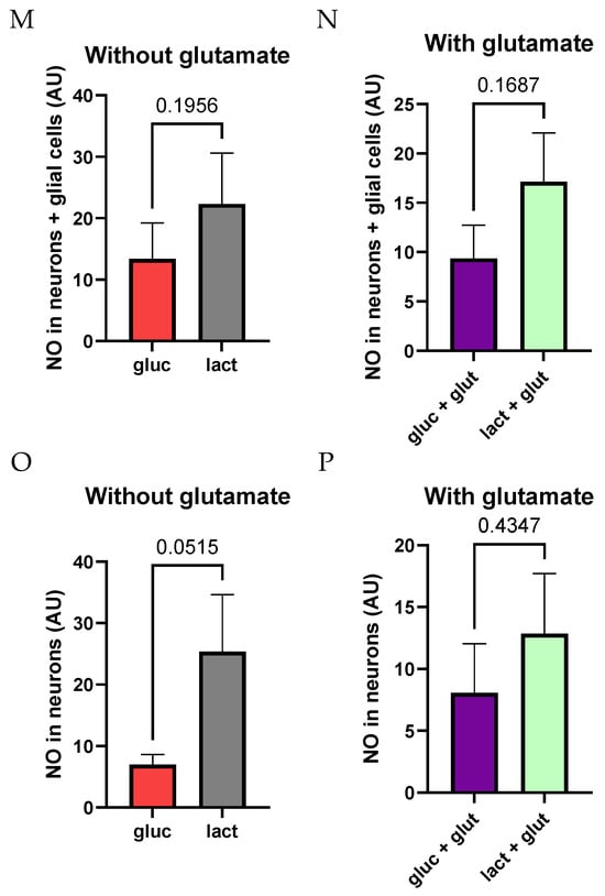 Intracellular NO in primary cortical cells isolated from Sprague-Dawley rats after adding different treatments: glucose (A–C), lactate (D–F), glucose + glutamate (G–I), and lactate + glutamate (J–L). The mean value of cells cultured with lactate increases the amount of endogenous NO in total cells (M,N) and neurons (O,P) in the absence (M,O) or presence (N,P) of glutamate. Glutamate did not induce any changes (N,P). The yellow circle is surrounding the neurons. Brightfield: (A,D,G,J). DAF: (B,F,H,K). Merge: (C,F,I,L). Data are presented as a mean ± SEM. n = 4 independent biological samples. Statistical significance was determined using ratio paired t-test. gluc: glucose; glut: glutamate; lact: lactate; DAF-FM: diaminofluorescein. Scale bar = 50 µm.