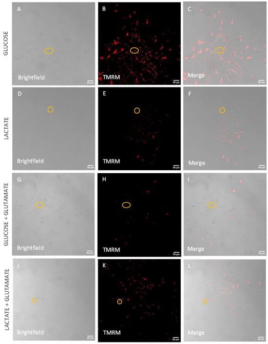 MMP (Δψ) of primary cortical cells isolated from Sprague-Dawley rats after adding different treatments: glucose (A–C), lactate (D–F), glucose + glutamate (G–I), lactate + glutamate (J–L). The cells cultured with glucose show a higher mean value for membrane potential in comparison to total cells (M) and significant changes in the neurons (O). The addition of glutamate increases the mean value of MMP in the presence of lactate of total cells (N) and leads to a significant change in the neurons (P). The yellow circle is surrounding the neurons. Brightfield: (A,D,G,J). TMRM: (B,F,H,K). Merge: (C,F,I,L). Data are presented as a mean ± SEM. n = 4 independent biological samples. Statistical significance was determined using Unpaired t-test (M,O) and Radio paired t-test (N,P). * p < 0.05. gluc: glucose; glut: glutamate; lact: lactate; TMRM: tetramethylrhodamine methyl ester. Scale bar = 50 µm.