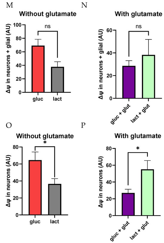 To analyze these data in live cells, neurons were separated from the other cells based on the size of their cellular body area calculated by using the images wherein neurons were stained with MAP2 (see Supplementary Method Section). We observed that in all cells (neurons + glial cells), there is a strong but not significant trend to increase the NO levels in the presence of lactate (Figure 5A–L, quantification Figure 5M–P). This trend was more pronounced, reaching a nearly significant level (p = 0.0515) in neurons (Figure 5O). Another parameter, which is often associated with neuronal death, is mitochondrial dysfunction. To characterize mitochondria, we determined mitochondrial membrane potential (MMP) in live cells. The images obtained in live cells are shown in Figure 6A–L. We did not observe a significant difference in the total cell population (Figure 6M,N). In contrast, there was a remarkable difference in the neurons (Figure 6O,P). MMP was significantly lower in the presence of lactate compared to cells incubated with glucose (Figure 6O), while in the presence of glutamate, we observed opposite changes, where MMP was higher in cells incubated with lactate (Figure 6P).